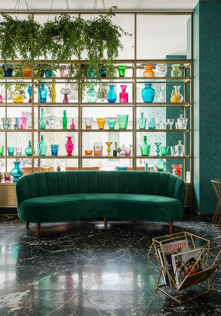 Inspiration for the multihued interiors came from Linda’s wardrobe that’s filled with vintage patterned suits and saturated colors. Dan, who wanted art and design at the epicenter, asked KLD to source internationally for diverse art, design, and craft that would look and feel at home in any international destination.