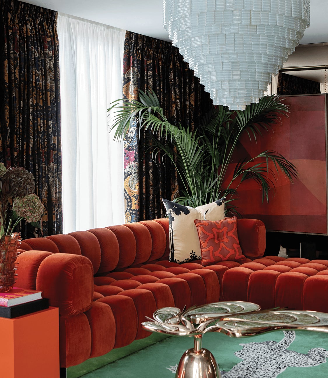 A new layout creates an effortless flow. “We wanted to encourage interaction and movement. The sunroom has a bright and sun-filled feel for [high-powered] meetings, whereas the other areas feel rich and moody and like evening spaces; they all have their purpose depending on the nature of the event,” she adds. “We also transformed the second bedroom into a fully upholstered and mirrored, luxury walk-in wardrobe with a concealed integrated pull-down bed for guests.”