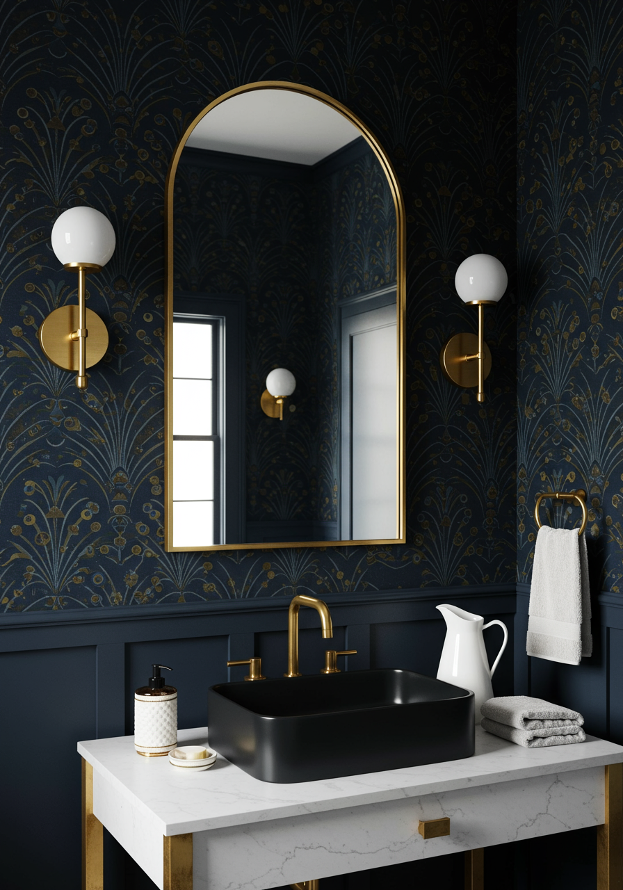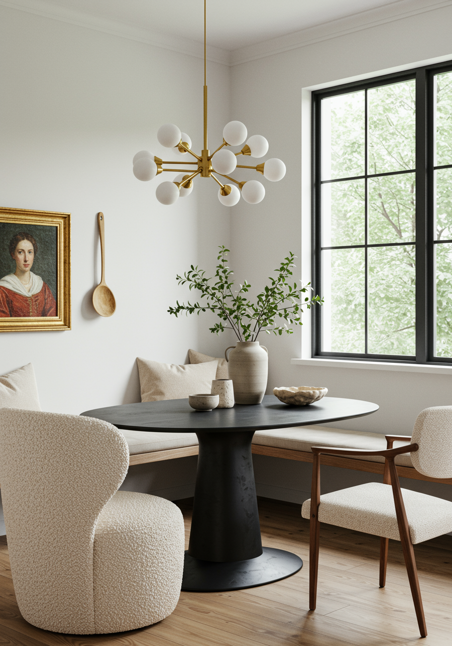 The black-and-white theme carries through the house, but each room expresses it differently. Even with black walls, the entry seems light and bright. The same black paint adds to the Colonel Mustard bedroom’s moodiness. The peacock wallpaper and brushed-gold fixtures glam up the dark-hued bath. Back in the dining room, brightness abounds in contrast to the black table and window trim.